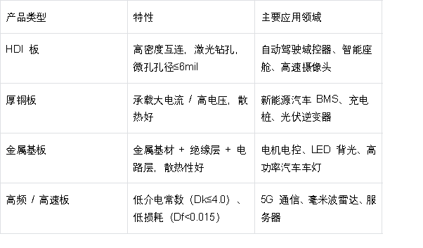 高性能化:高频高速板(Dk≤4.0、Df0.015)、厚铜板(承载大电流)、金属基板(高散热)需求增长。