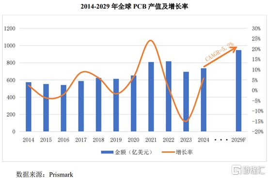 据Prismark数据,2024年受益于AI服务器及相关高速网络基础设施推动,以及智能手机市场复苏,全球PCB产值同比增长5.8%至735.65亿美元。